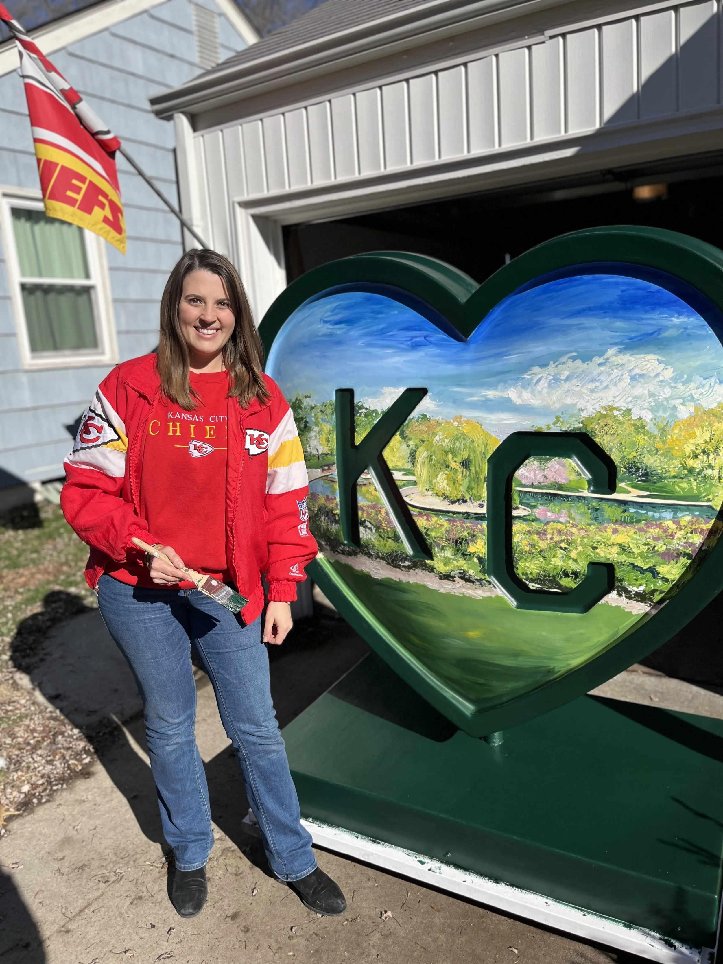 Now, I have had over a decade to develop my personal painting style. I have found a passion in working with palette knives, to create Impressionist style landscapes. In the past few years, I have delved more into sharing my art. I have done so through commission work, philanthropic donations, participation in various juried art shows and community arts events. In both 2022 and 2023, I had the privilege of displaying my work at the Wichita Autumn and Art weekend. I will be back at Autumn and Art this Fall, Sept. 13-15th! Additionally, for the past three years, I have worked with the Philanthropic Board at Children’s Mercy Hospital, donating paintings for their Red Hot Nights, annual fundraiser event. Then, this past year, I had the honor of being selected by jurors to paint a large sculptural piece within the 2024 Parade of Hearts in Kansas City. This event benefits Children’s Mercy, KU Medical Center, the Family Conservancy, and Arts & Culture within Kansas City.